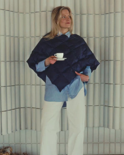 HoneyberryBeautiful as candy and light as a dream. Drape the down poncho over your shoulders and enjoy its soft warmth. The elegant Unelma is perfect for indoor use—capturing admiration at various events or keeping you cozy on the couch or while working remotely. The down poncho can also comfort nursing mothers or sleeping babies in your arms. Unelma is crafted from ultra-light recycled microfiber fabric and is 100% pure. It's a durable, washable product designed for a softer everyday life.